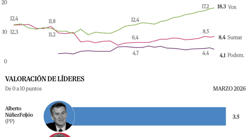 Tras tres meses de cada continuada y marcando sus peores datos de la legislatura, el PSOE logra en marzo revertir la tendencia con un ligero repunte: del 26,1% del voto que reuna en febrero, sube ahora al 26,4%. No le sucede lo mismo al PP, que encadena ya su sptimo mes a la baja. Feijo reunira hoy el 31,9% de las papeletas de los espaoles, medio punto menos que en febrero (32,4%) y 1,2 por debajo de su marca en las elecciones de julio de 2023 (33,1%). No es la primera vez en la legislatura que el PP aglutina un porcentaje peor al que obtuvo en las urnas el 23-J -ya lo hizo en enero y febrero-, pero s es la primera ocasin en la que esto se traduce en menos diputados para los de Feijo, que en el ltimo mes se han dejado cuatro escaos. Los 135 asientos que obtendra ahora quedan lejos de los ms de 160 que le lleg a estimar el sondeo en marzo de 2024.