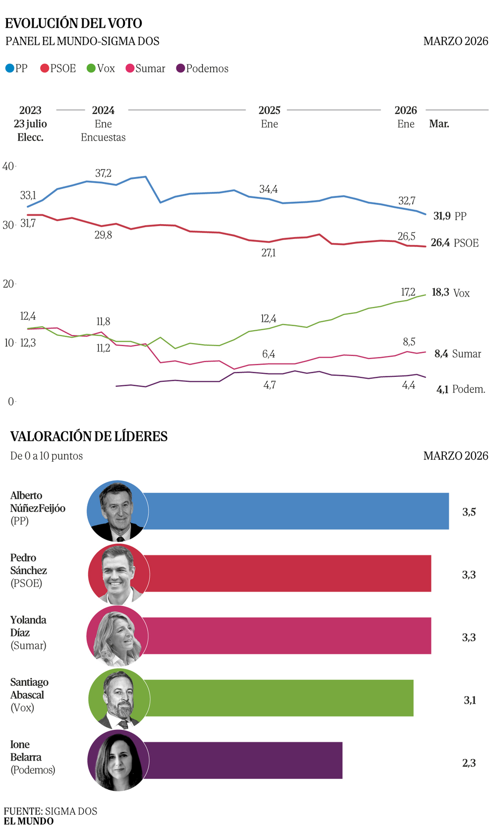 Tras tres meses de cada continuada y marcando sus peores datos de la legislatura, el PSOE logra en marzo revertir la tendencia con un ligero repunte: del 26,1% del voto que reuna en febrero, sube ahora al 26,4%. No le sucede lo mismo al PP, que encadena ya su sptimo mes a la baja. Feijo reunira hoy el 31,9% de las papeletas de los espaoles, medio punto menos que en febrero (32,4%) y 1,2 por debajo de su marca en las elecciones de julio de 2023 (33,1%). No es la primera vez en la legislatura que el PP aglutina un porcentaje peor al que obtuvo en las urnas el 23-J -ya lo hizo en enero y febrero-, pero s es la primera ocasin en la que esto se traduce en menos diputados para los de Feijo, que en el ltimo mes se han dejado cuatro escaos. Los 135 asientos que obtendra ahora quedan lejos de los ms de 160 que le lleg a estimar el sondeo en marzo de 2024.