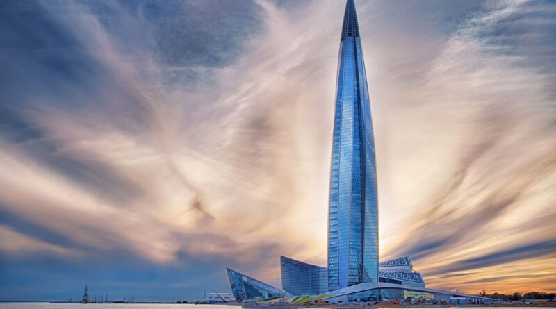 The tower was built as the headquarters of Gazprom, Russia’s state-backed energy company, and features a twisting shape.