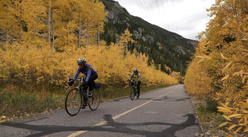 Cyclists ride among leaves ib Sept. 30, 2025 in Frisco, Colo.