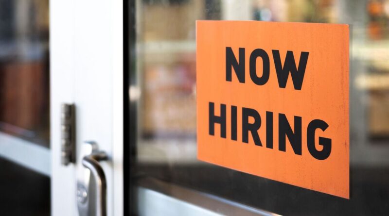 “now hiring” sign posted on business door