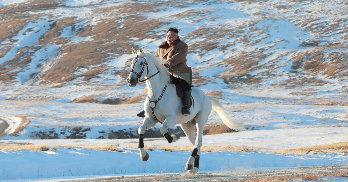 North Korean leader Kim Jong Un rides a horse during snowfall in Mount Paektu