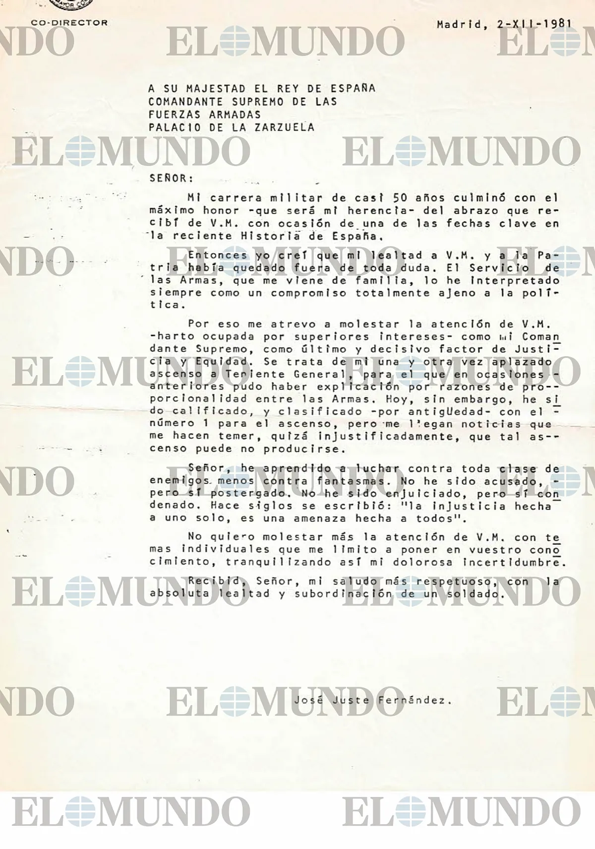 Juste se sent y redact la misiva para el Rey Don Juan Carlos. Adems de lo publicado al principio de este texto, en el tercer prrafo, Juste hace lo que parece un ltimo intento de ascender: “Me atrevo a molestar la atencin de V.M. como ltimo y decisivo factor de Justicia y Equidad. Se trata de mi una y otra vez aplazado ascenso a teniente general”, le explica. A continuacin, sentencia: “Seor, he aprendido a luchar contra todo tipo de enemigos, menos contra fantasmas”. Tras una semana sin respuesta, el 9 de diciembre, Juste envi una carta al ministro de Defensa, Alberto Oliart Saussol, para comunicar su paso a reserva activa. Don Juan Carlos contest a la misiva del general el 12 de enero de 1982, cuando ya era imposible su ascenso. “Lamento que las circunstancias te hayan aconsejado solicitar el paso a la reserva activa. Respeto tu decisin y nicamente quiero hacerte patente mi amistad y mi afecto“, firm el Rey.