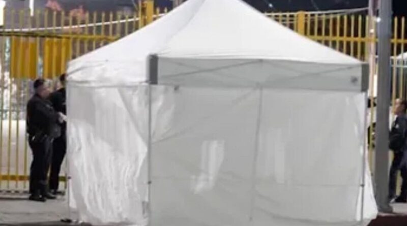 The man is also alleged to have slit his throat, stabbed himself, and tried to cut off his own arm. A white tent was quickly put in place at the scene by police. Images from the area show pools of blood on the pavement next to the white tent.