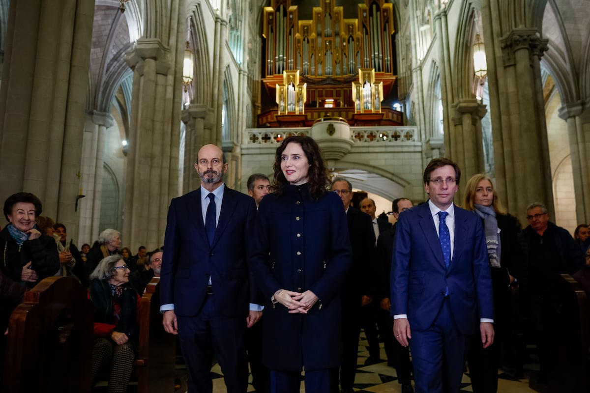 Ayuso, vestida de luto, entró en la catedral acompañada por el alcalde de la ciudad, José Luis Martínez Almeida, y el delegado del Gobierno en Madrid, Francisco Martín Aguirre. Detrás aparecieron el presidente de la Asamblea regional y el presidente del Senado, todos con traje y chaqueta. La misa se prolongó durante más de una hora. Participaron los tres obispos de la Provincia Eclesiástica de Madrid -las diócesis de Madrid, Getafe y Alcalá de Henares- en una misa que empezó con el Réquiem y acabó con el Notre Père.