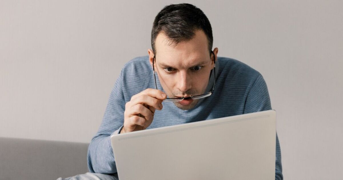 An astonished-looking man looking at laptop screen while sitting on sofa at home