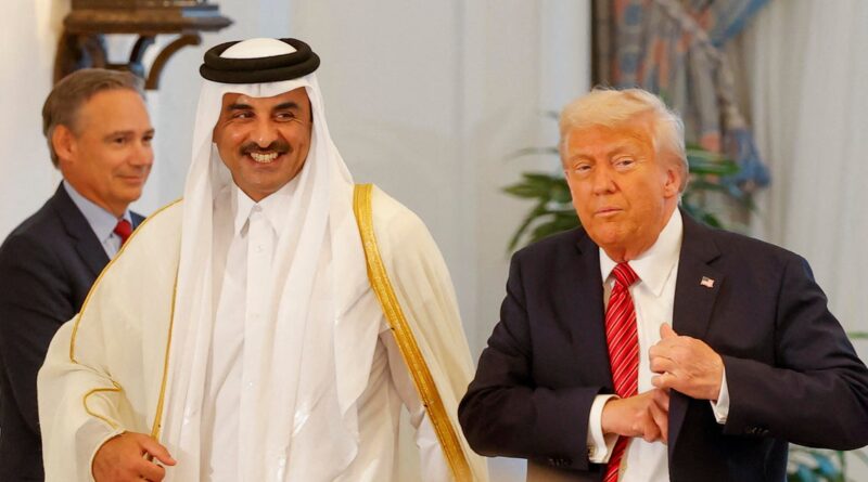 Qatar’s Emir Sheikh Tamim bin Hamad al-Thani and President Trump leave after a ceremony at the Royal Palace in Doha, May 14, 2025.